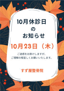 - 2025年10月 休診日のお知らせ誠に勝手ながら、都合により終日休診とさせていただきます。ご迷惑をおかけして申し訳ございませんが、どうぞ宜しくお… 続きを読む: 2025年10月 休診日のお知らせ