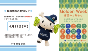 - 2026年4~5月 GW休診日のお知らせ誠に勝手ながら、都合により終日休診とさせていただきます。ご迷惑をおかけして申し訳ございませんが、どうぞ宜しくお… 続きを読む: 2026年4~5月 GW休診日のお知らせ